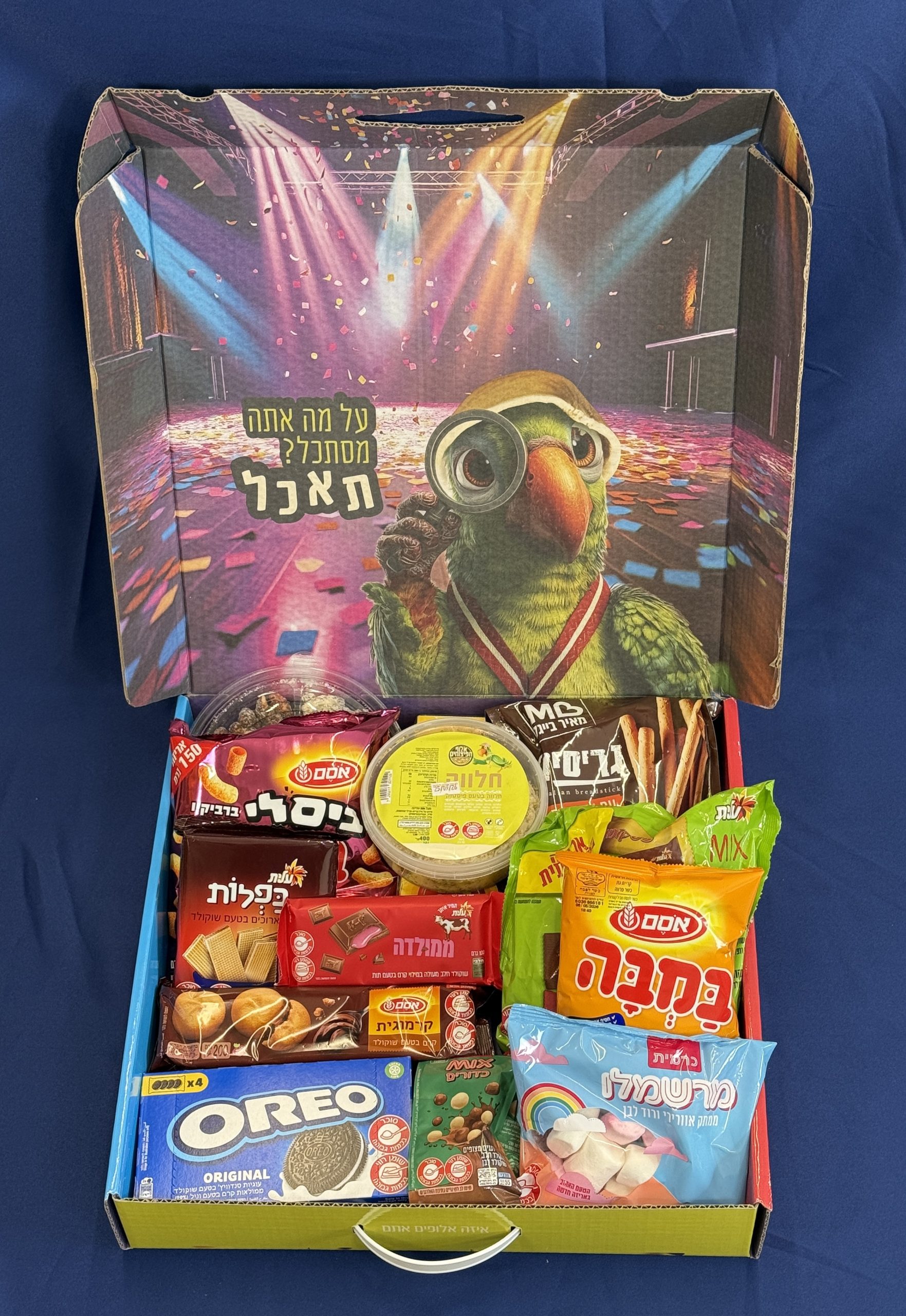 תכולה: תערובת אגוזים ובוטנים מקורמלים חלווה גרסיני שוקולד פרה תות במבה 80 ג״ר מרשמלו רבע לשבע אוראו קרמוגית בפלות מיקס כדורי שוקולד מיקס מארז שוקולדים של עלית מיקס במבה וביסלי בון בון שוקולדים מטבעות שוקולד